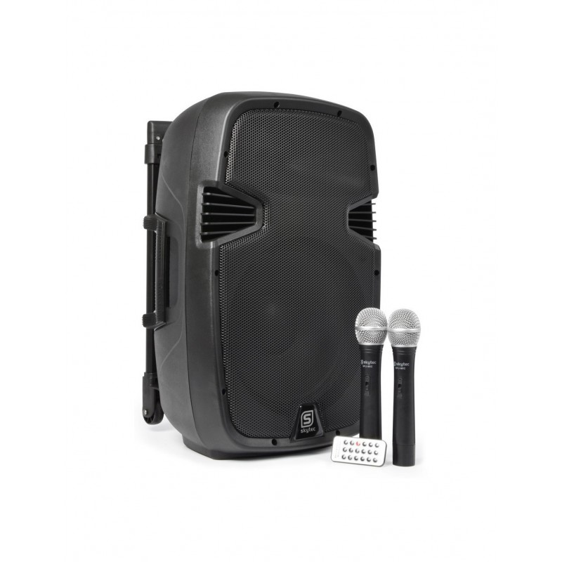 Sistema de som profissional portátil de 12" 500W incorporando 2 microfones sem fios UHF que operam em distintas frequencias, comando à distancia e reprodutor integrado de MP3 por USB e SD Card. Este sistema tudo em um, alimenta-se por 220V ou por bateria interna recarregável de 12V para alimentar o woofer de 12" e motor de agudos. Na parte traseira encontramos 2 entradas para microfones com efeito echo, entrada de linha, controlos de MP3 e equalizador de 5 bandas.